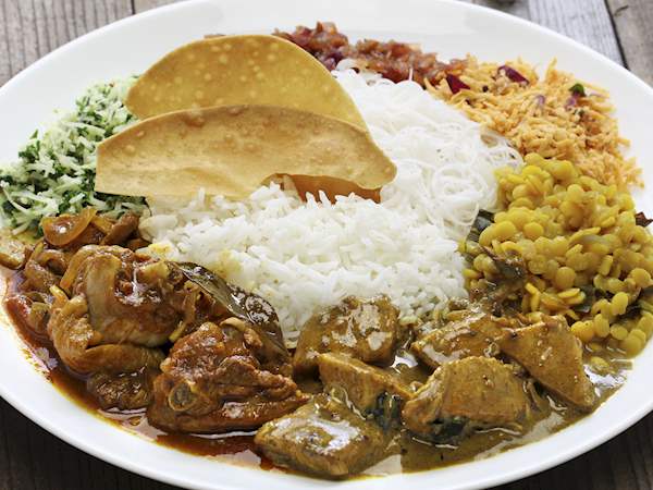 Voici les plats que l'on trouve le plus souvent : dahl (purée de lentilles), ladies fingers (ou gombo : une sorte de haricot-courgette strié et un peu gélatineux), patate douce, manioc, coco sambol (noix de coco râpée, oignons, piment, citron, sel), haricots en sauce, fleurs de banane, papadams (de petites galettes de farine de lentilles frites et craquantes) et parfois du chutney de mangue...